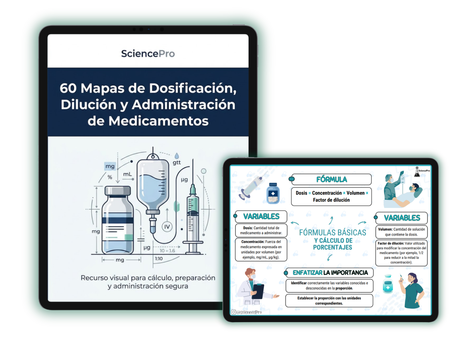 Refuerza la parte más práctica de la farmacología con mapas visuales sobre cálculo de dosis, conversiones, concentraciones, diluciones, vías de administración, etiquetado y prevención de errores clínicos..